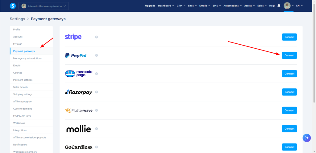 This is where all the magic happens. You will see a list of all the payment processors Systeme.io can connect to.