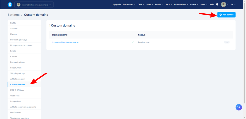 You can check the status by going back to Systeme.io, clicking Custom Domains, and looking at the status of your domain. It will say Pending, then eventually change to Ready to use.